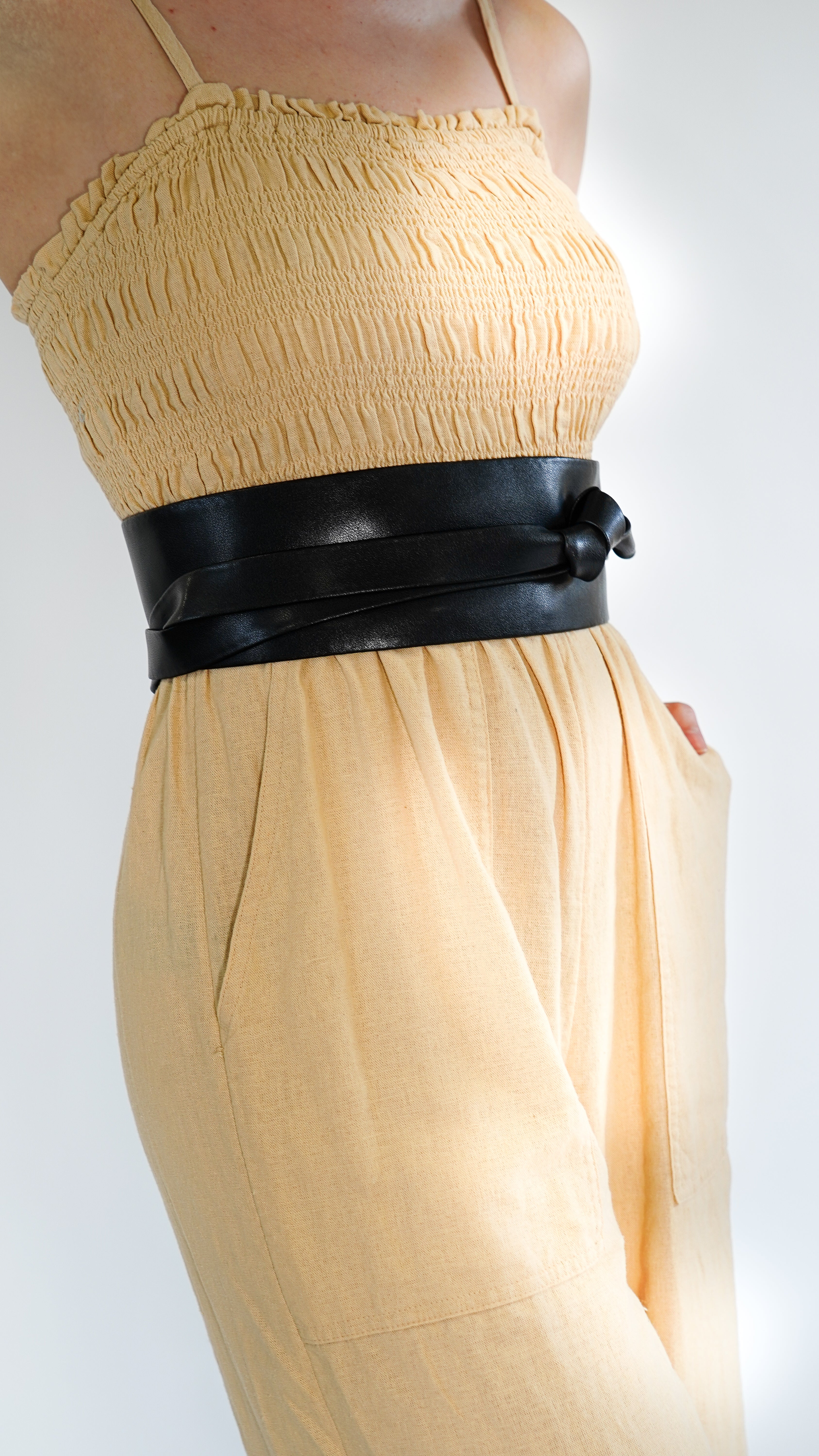 This wrap belt is a staple accessory piece within every woman's wardrobe. This one size fits all belt wraps around the waist and flatters the female physique. The available color options for this leather belt include black, brown, and camel.