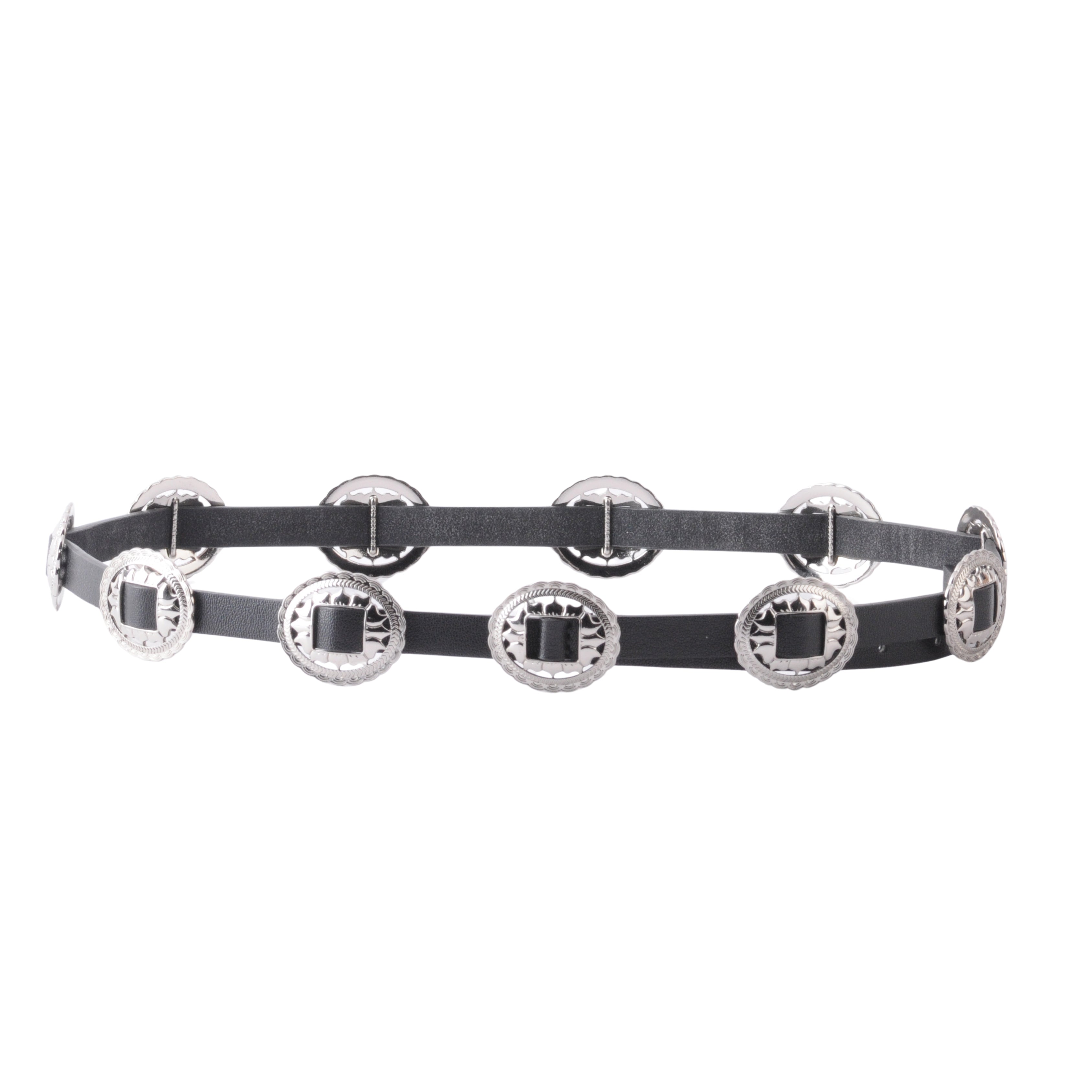 Elevate any outfit with our Twist-Through Leather Concho Belt, featuring shiny silver floral conchos that add a touch of boho-chic elegance. The thin leather strap threads effortlessly through each concho, creating a stylish, adjustable fit that’s both functional and fashion-forward. Perfect for cinching dresses, layering over tunics, or adding flair to jeans, this belt blends classic western-inspired design with modern shine.