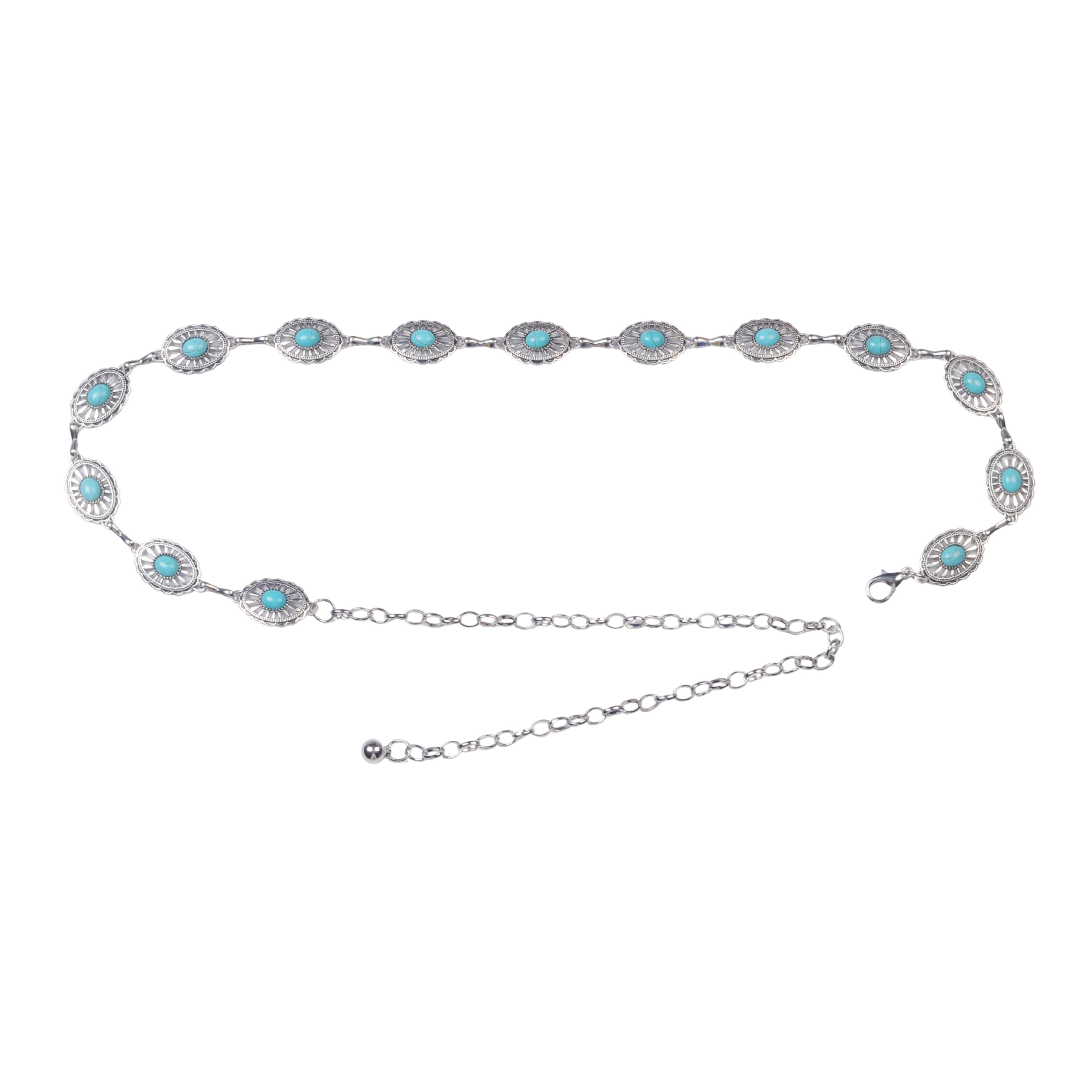 A subtle nod to Southwestern style, our Small Concho Chain Belt with Turquoise adds a pop of color and charm to any look. Featuring petite silver conchos accented with turquoise center stones and linked by a delicate chain, this belt brings a vintage-inspired, boho touch to denim, dresses, and skirts. Lightweight and adjustable for easy everyday wear.
