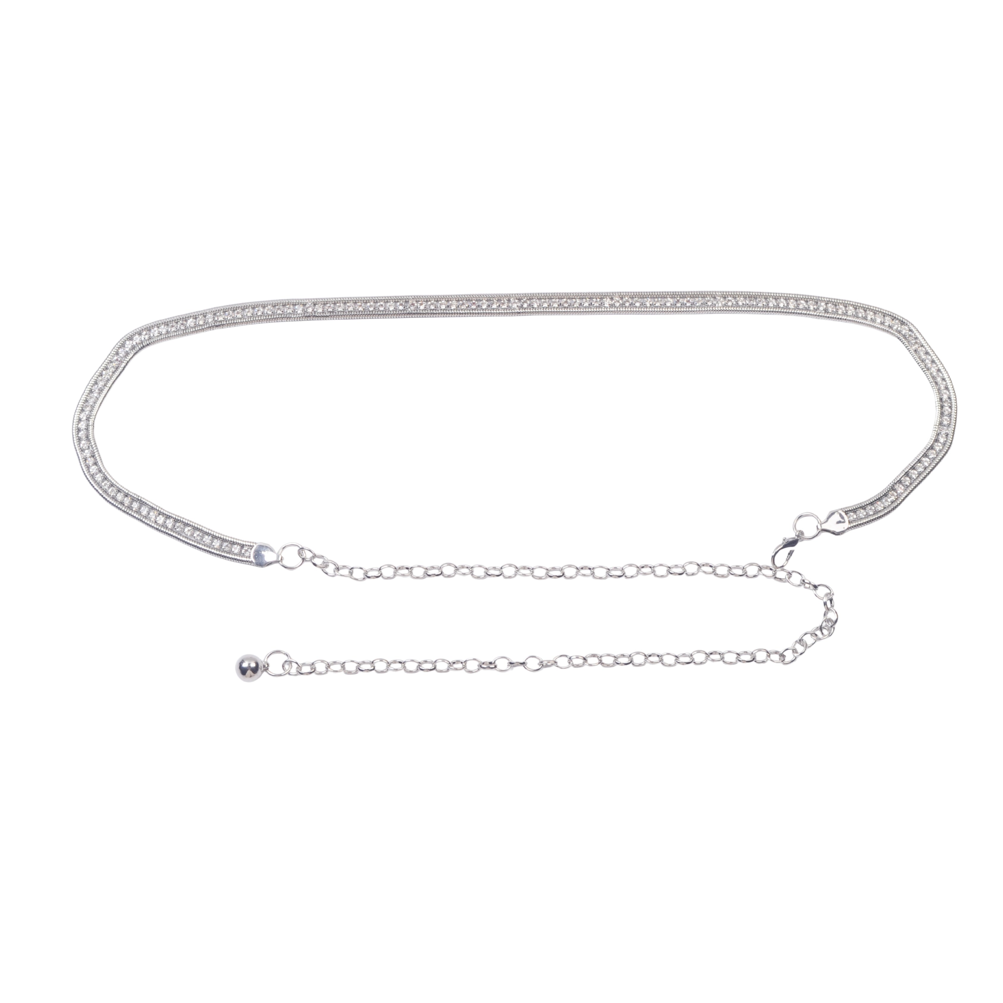 Sleek with maximum sparkle — our Singular Rhinestone Rope Chain Belt is made to turn heads. Crafted with a rope-style chain and a striking stretch of consecutive rhinestones, this belt brings a glamorous shine to any outfit. The elongated rhinestone centerpiece catches the light with every step, making it perfect for dressing up sleek trousers, body con dresses, or low-rise denim. Lightweight and adjustable, it’s the ultimate accessory for nights out, special occasions, or anytime you want a little extra dazzle.
