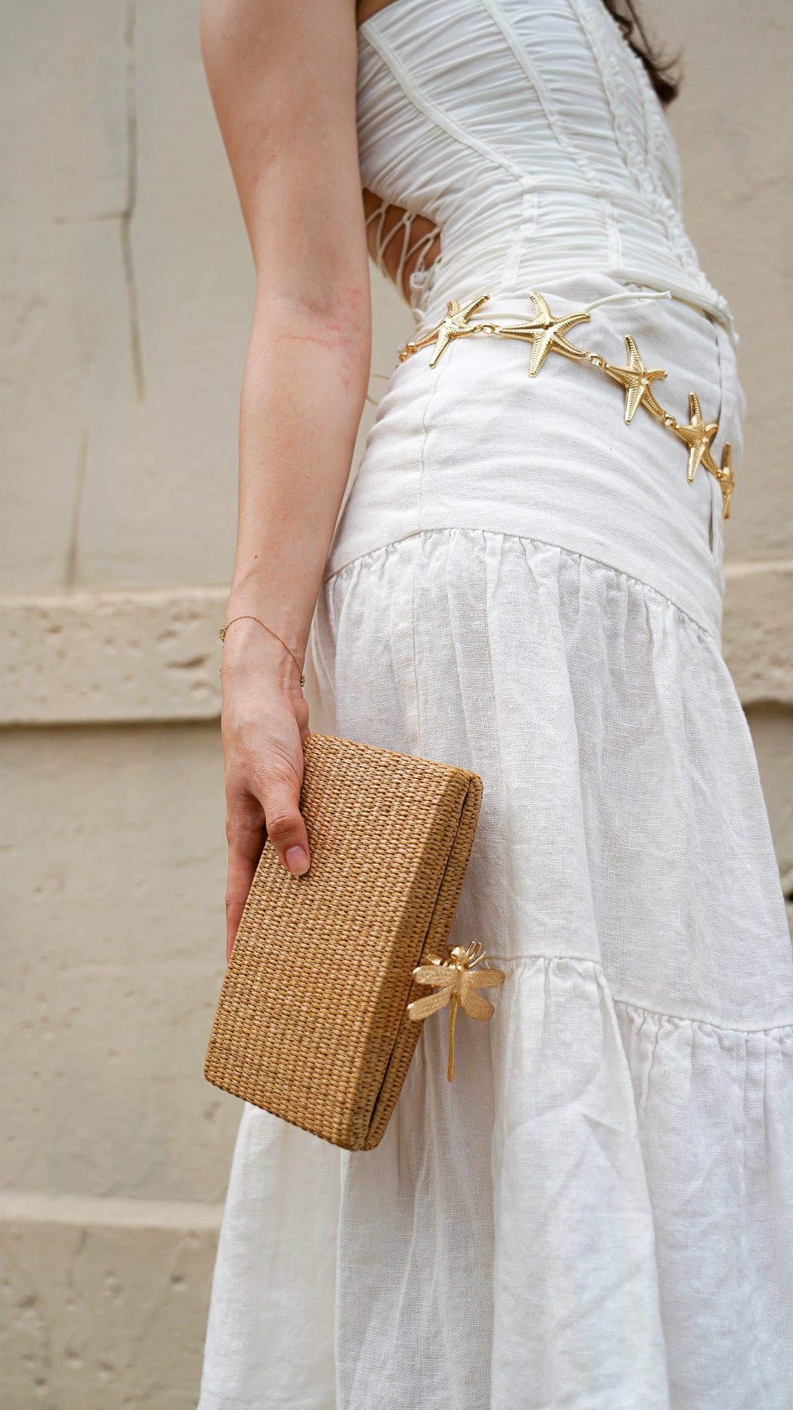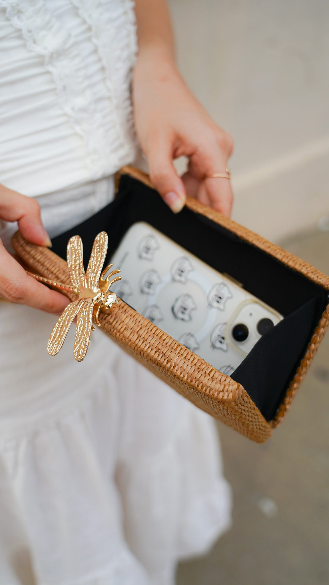 Discover enchanting style with our Dragonfly Hardware Raffia Clutch, featuring a whimsical dragonfly accent on the top and a chic chain crossbody strap. This unique accessory seamlessly blends natural charm with a touch of fantasy, as the raffia material adds a beachy vibe, and the dragonfly hardware brings a touch of whimsical elegance. The accompanying chain crossbody strap adds modern versatility to this timeless piece. Make a statement with this fashionable clutch, perfect for those who appreciate the fusion of nature-inspired elements and contemporary design. Elevate your style and embrace the beauty of the dragonfly!