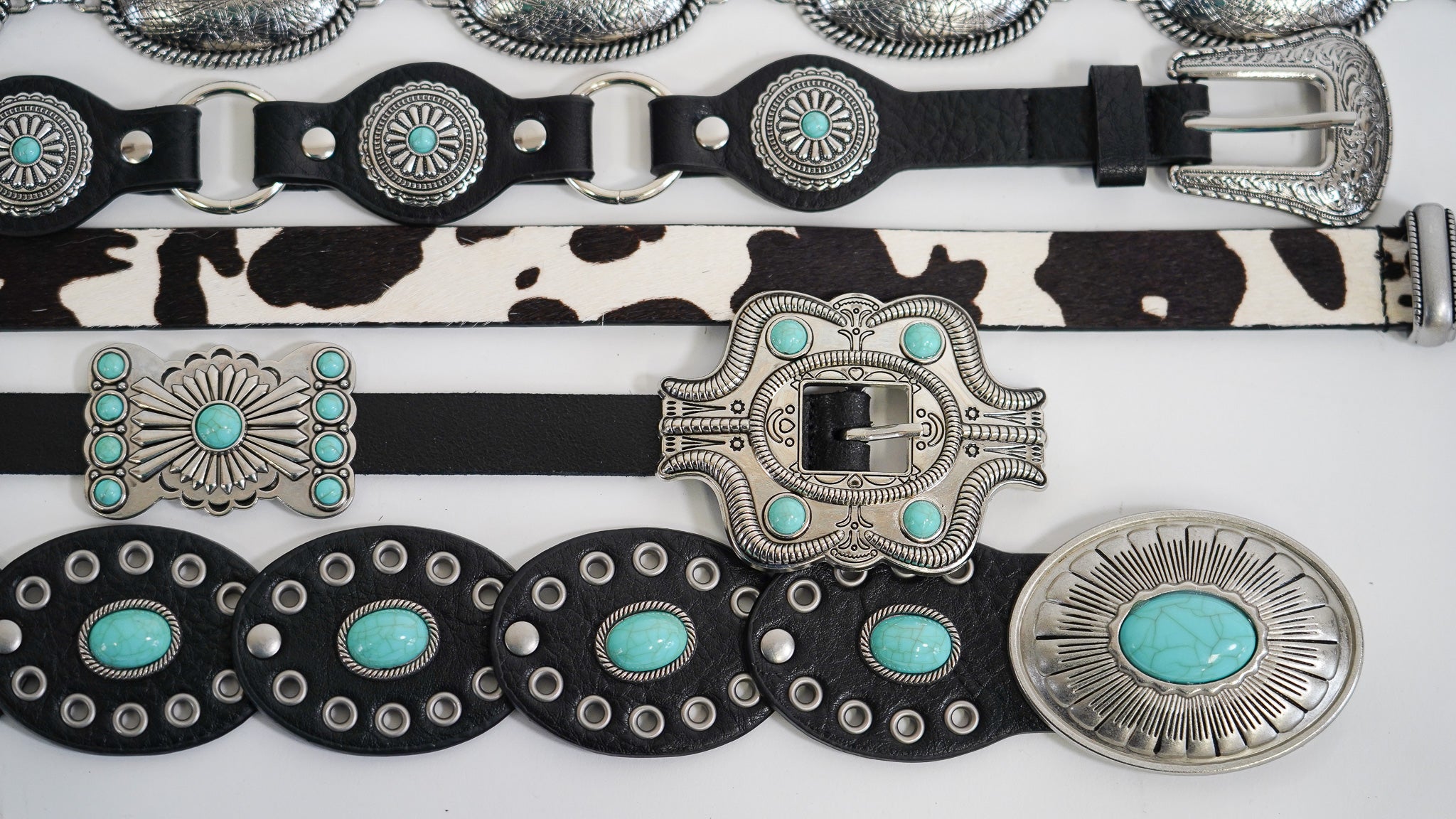 This belt features a rich leather strap adorned with an eclectic mix of silver-tone conchos, each showcasing intricate Western-inspired engraving. The conchos vary in shape—round, oval, and rectangular—creating a collected, heirloom look, and are accented with turquoise-colored stones set at their centers and along the edges. The engraved detailing has a sunburst and scalloped motif that adds depth and texture, while the contrasting cool turquoise pops against the warm leather base. Finished with a decorative silver buckle featuring matching turquoise accents, this belt feels bold yet artisanal—perfect for elevating denim, dresses, or layered Western looks.